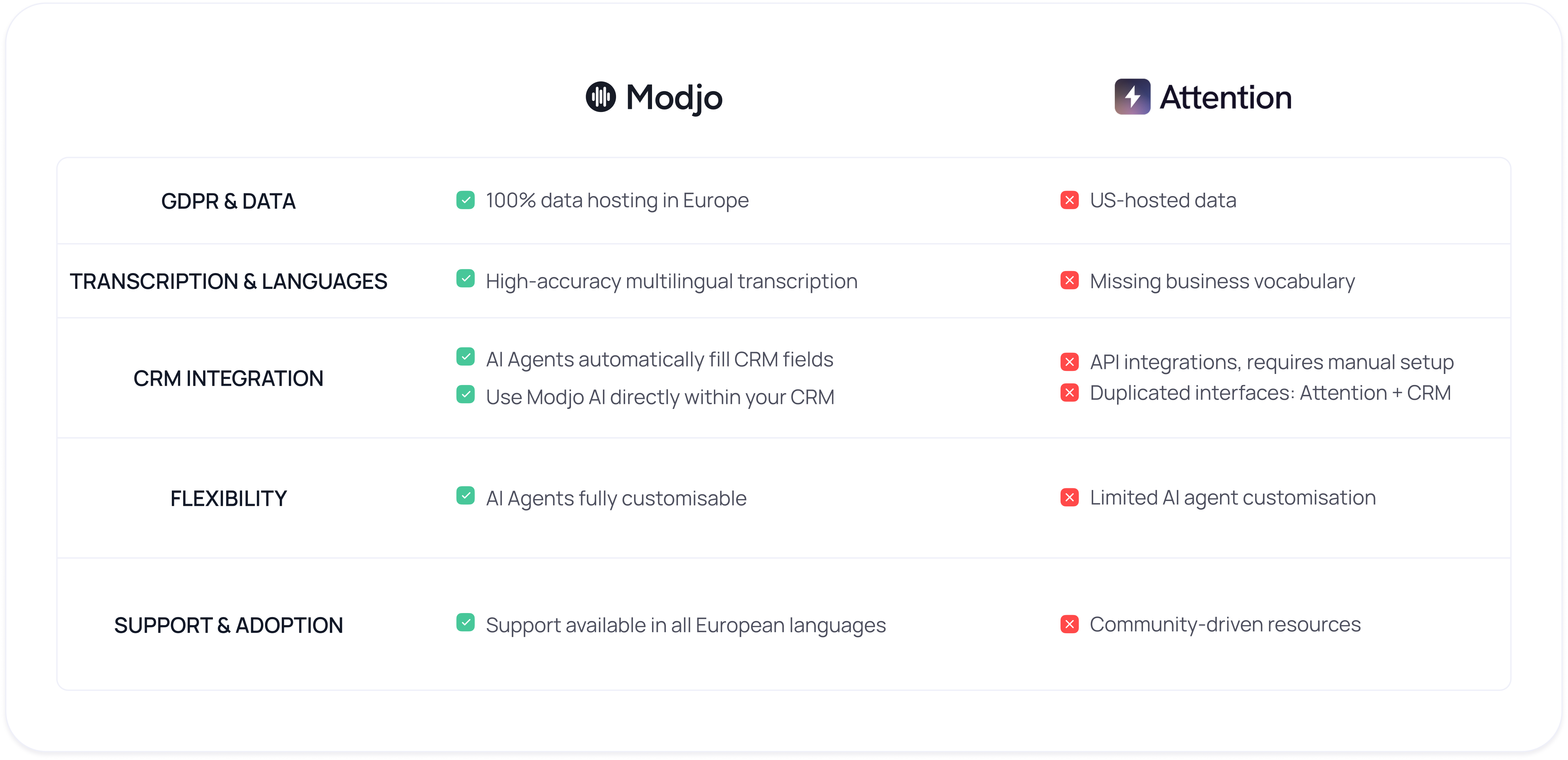 Yes. Modjo provides all core conversation intelligence capabilities while offering superior transcription quality, European data hosting, and native CRM integration.