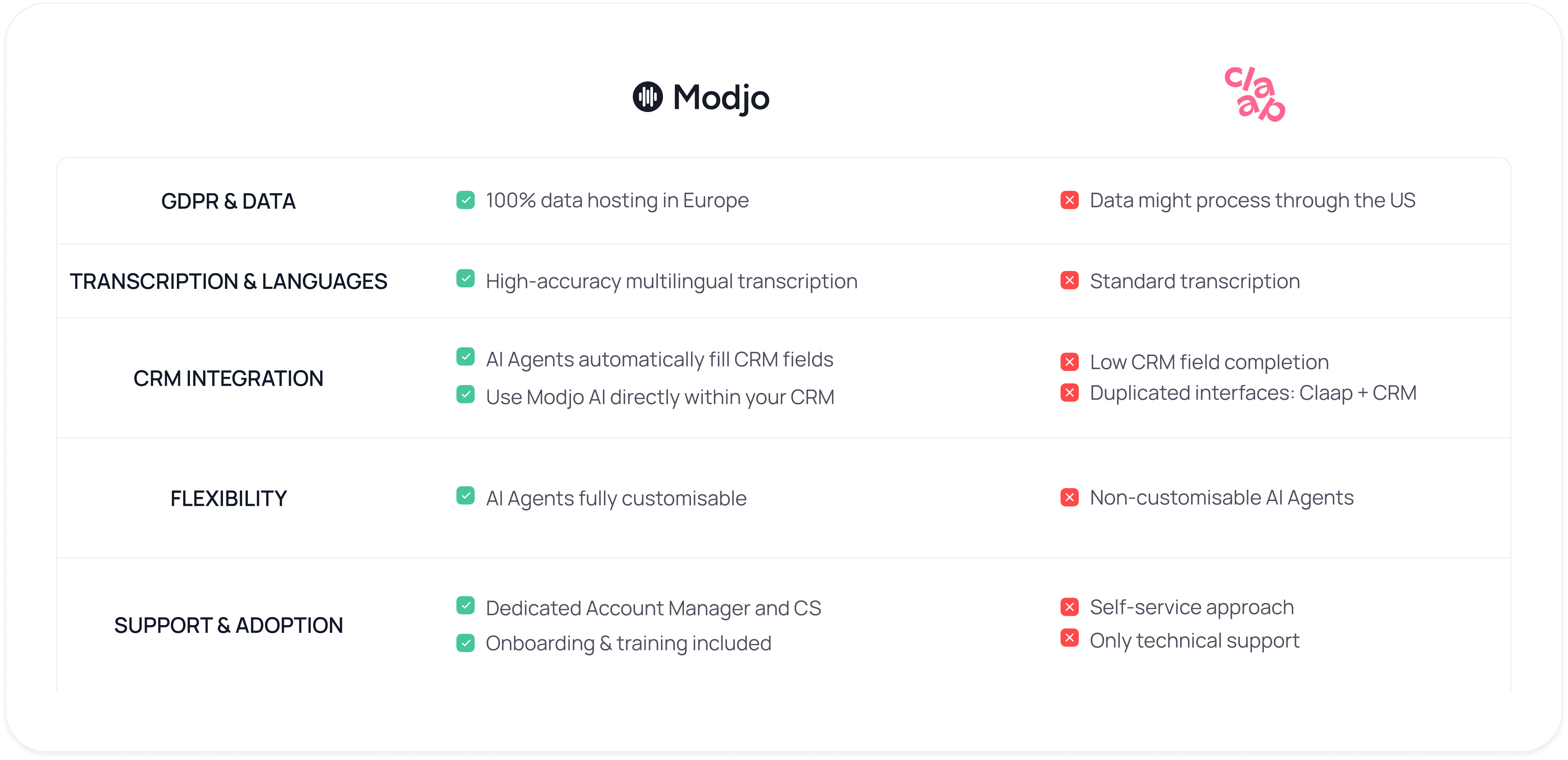 Modjo's AI models have been trained exclusively on B2B sales conversations since 2020, delivering superior accuracy in deal insights, competitive intelligence, and revenue forecasting. Claap uses general-purpose AI that lacks the sales-specific intelligence needed for strategic business decisions.