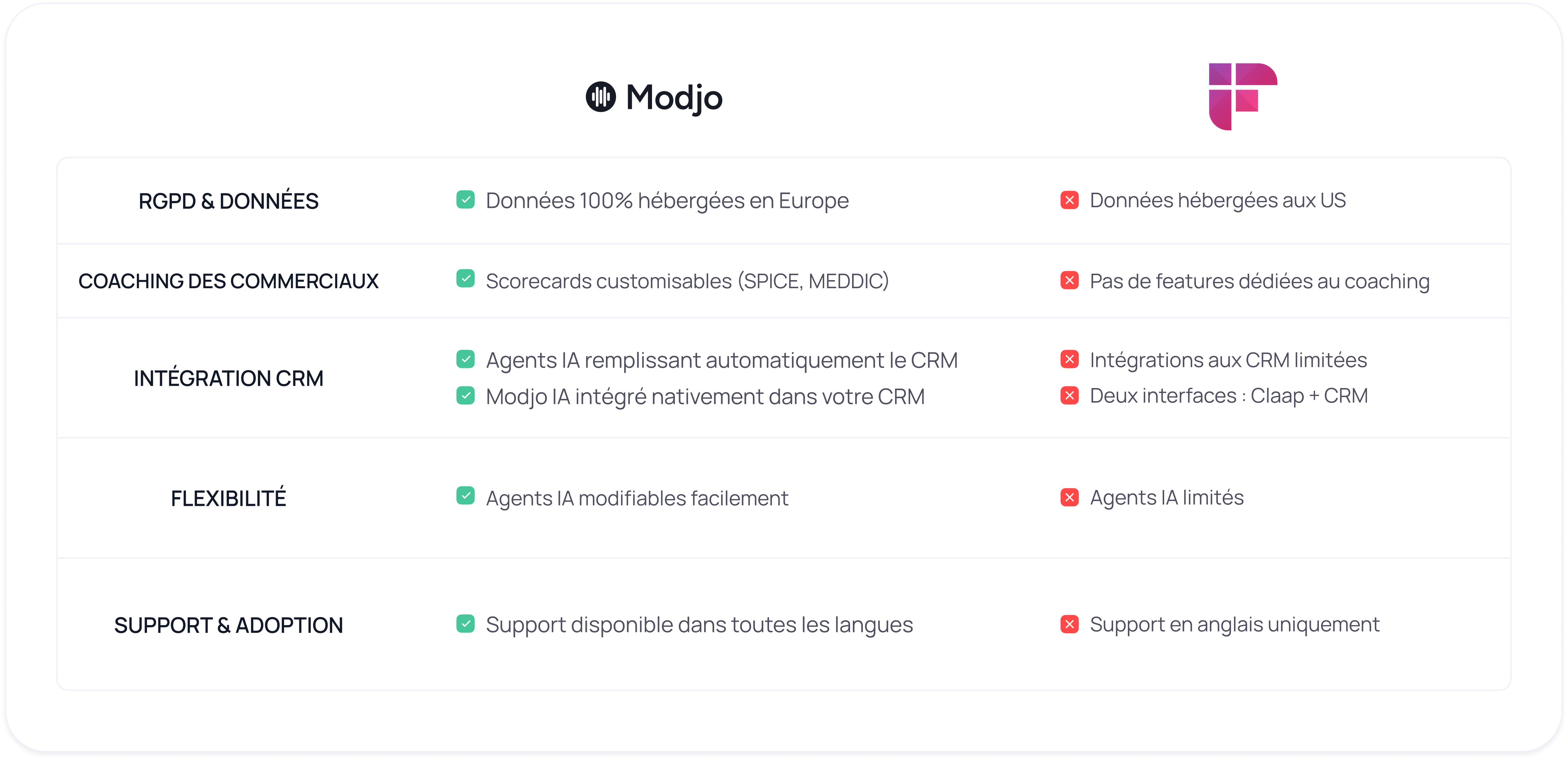 Notre équipe customer success vous accompagne dans la migration des données pour assurer la continuité. Nous pouvons importer votre historique de conversations et configurer des workflows équivalents dans Modjo, pour ne perdre aucun insight commercial précieux.